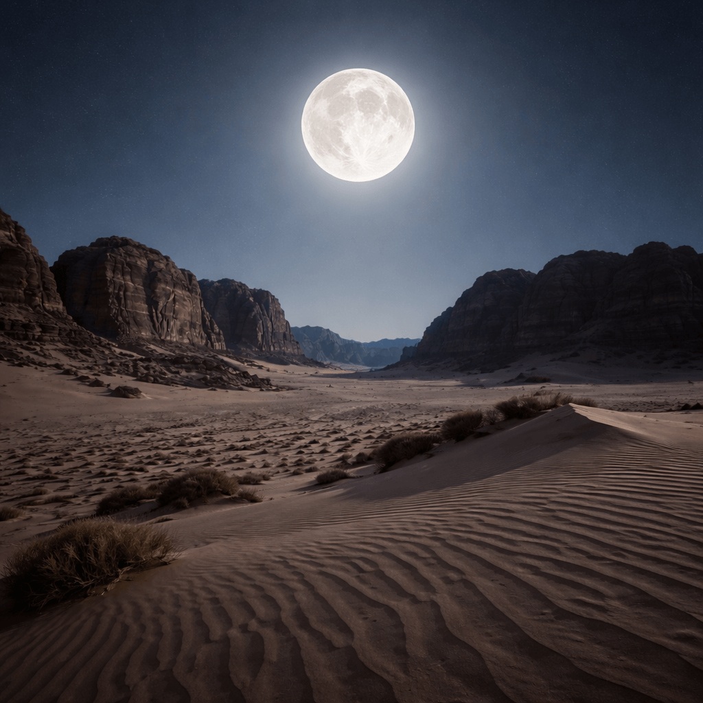 けれど、その代わりに現れるのが、月明かりに照らし出された砂漠と岩山の世界です。真っ暗な夜とはまったく違い、岩の輪郭や砂の起伏が浮かび上がり、まるで別の惑星にいるかのような景色が広がります。